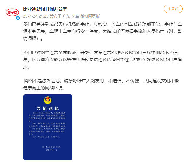 7月24日,据比亚迪新闻打假办公室:
