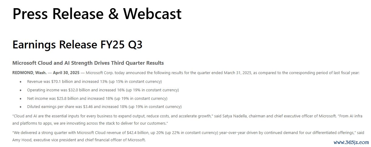 美东时间周三盘后,科技巨头微软公布了2025财年第三财季财报。由于Azure云计算业务的强劲增长,微软的季度营收超过预期,推动该公司股价在盘后交易中上涨逾8%。